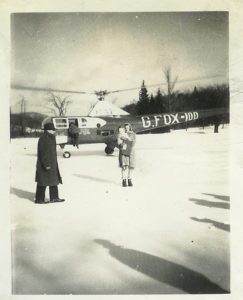 Long before Fed Ex or DHL, this G. Fox & Co. helicopter made a door-to-door delivery to a Norfolk family. The year was 1947, and the helicopter was part of the company’s promotion of its 100th year as a retail fixture in Hartford. At that time, Bob Steele hosted the G. Fox Morning Watch radio show on WTIC (precursor to the Bob Steele Show), and listeners tuned in daily to find out where and when the helicopter would make its next stop. And so on a cold January morning, a crowd gathered by the baseball diamond on Mountain Road to welcome the helicopter to the Ice Box of Connecticut. The delivery was a package of baby clothes, and the recipient was Dr. and Mrs. Richard Barstow’s young son, Ricky, pictured here in the arms of his mother Lorraine.