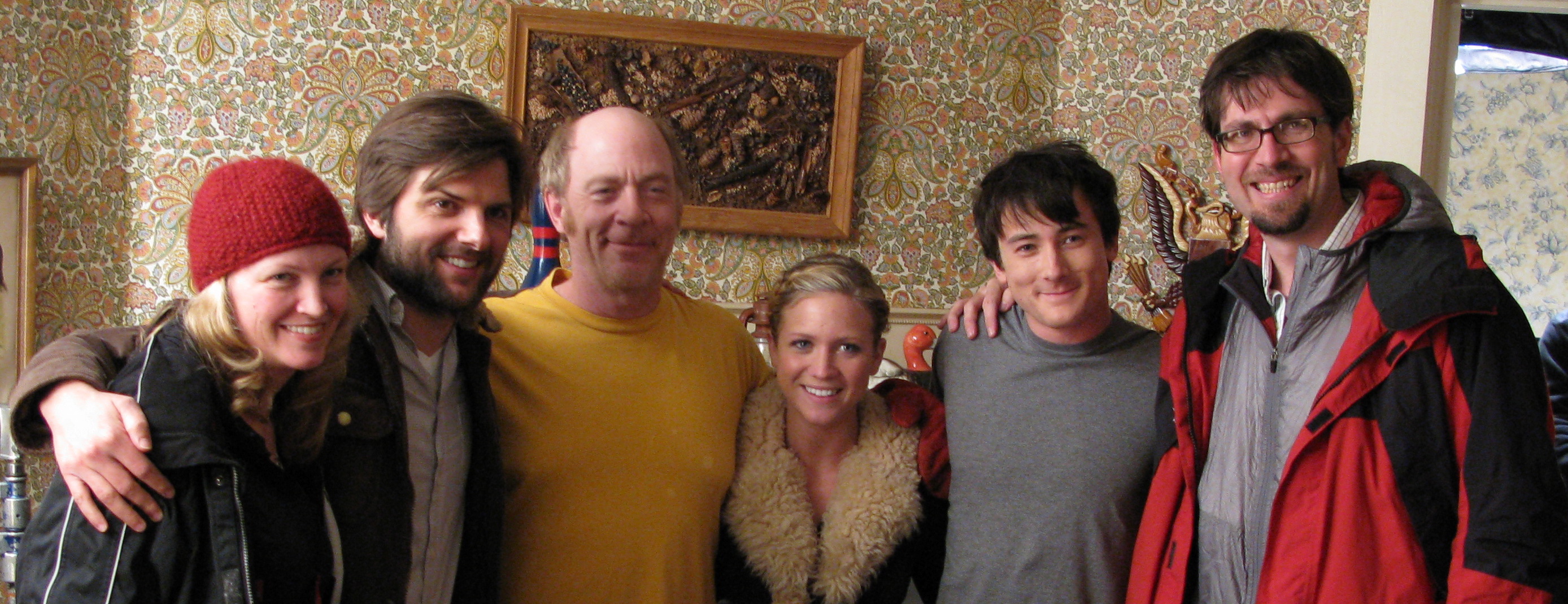 Cast and Crew of “The Vicious Kind” taking a break from filming inside a house on Laurel Way. From left to right: Lindsey Lanzillotta (Producer), Adam Scott (Actor), J.K. Simmons (Actor), Brittany Snow (Actress), Alex Frost (Actor), Dallas Dickinson (Producer).
