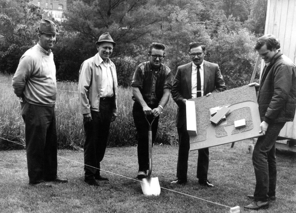 Norfolk Then Fire Chief Martin O’Connor takes the first dig during ground-breaking ceremonies for a new firehouse on June 6, 1970. Also pictured are (from left): Peter Mulville (builder), Walter Allyn (Selectman), O’Connor, Robert Mead (Chairman of the Building Committee), and Russell Childs (architect). The need for larger quarters had become particularly pressing when the department’s new fire engine would not fit in the original firehouse in the Royal Arcanum building and had to be housed in a barn on Emerson Street. Fundraising was begun in 1969, and the cost of the new firehouse—$75,000— was raised by public subscription and an anonymous gift.