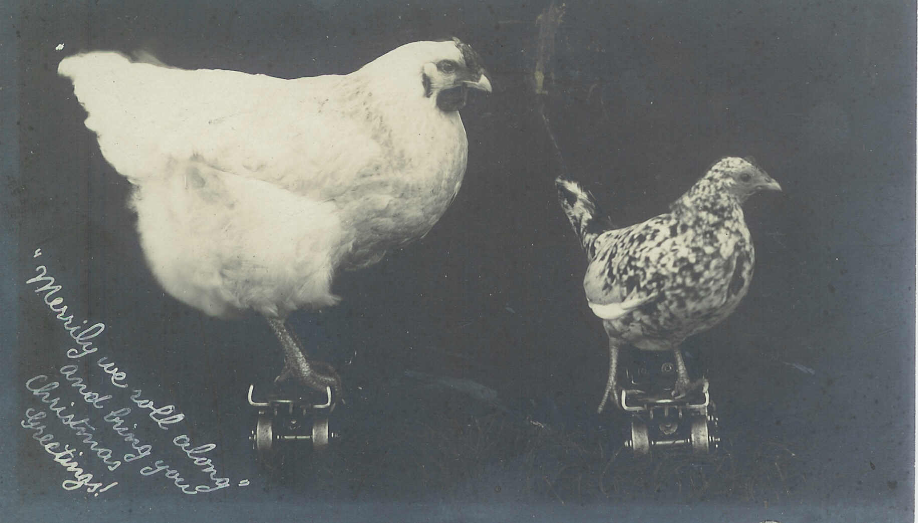 Chickens on roller skates? Marie Kendall was a very creative photographer, and she must have had some pretty cooperative chickens, merry or not as they “roll along” in this Christmas greeting. Many of Kendall’s surprising and delightful images of Norfolk can be found in Picturing Norfolk: 1758-1958, available for holiday purchase at the Norfolk Library and the Norfolk Historical Museum (542-5761).