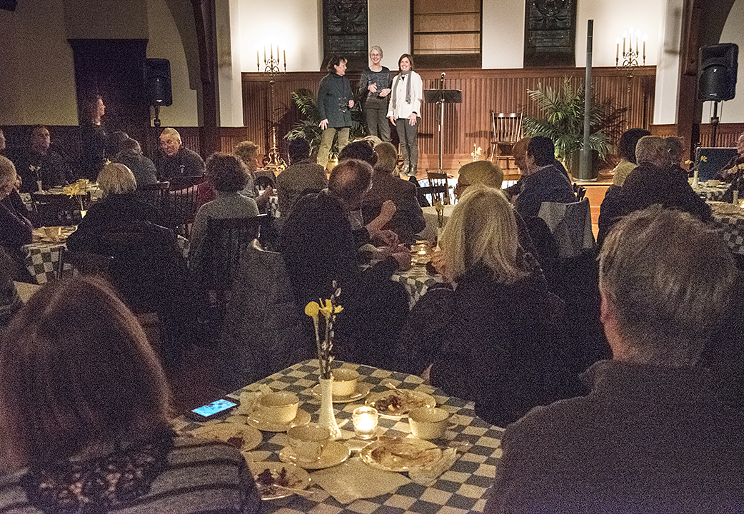 Last month’s Coffee House in Battell Chapel was a warm and convivial evening. Conceived as a different kind of fundraiser for the Congregational Church, the event offered a warm, candlelit setting, delicious homemade desserts and coffee and also storytelling and poetry reading by local authors. Gloria Gourley, a member of the church’s fundraising committee, says the idea was modeled in part on the Moth Radio Hour, which presents stories told live before an audience. “We have so many interesting people around us,” Gourley says, “why not give them an opportunity to tell their stories?” All three writers at this inaugural Coffee House are well known to Norfolk audiences. Jude Mead started the evening off with two short stories, the first autobiographical; Susannah Wood followed, reading some of her recent poems; and Rosemary Gill finished the entertainment with a selection from her memoir in progress. Gouley is hoping that March’s Coffee House will be the first of a series, and she’s encourages people to volunteer or to suggest other storytellers in town.