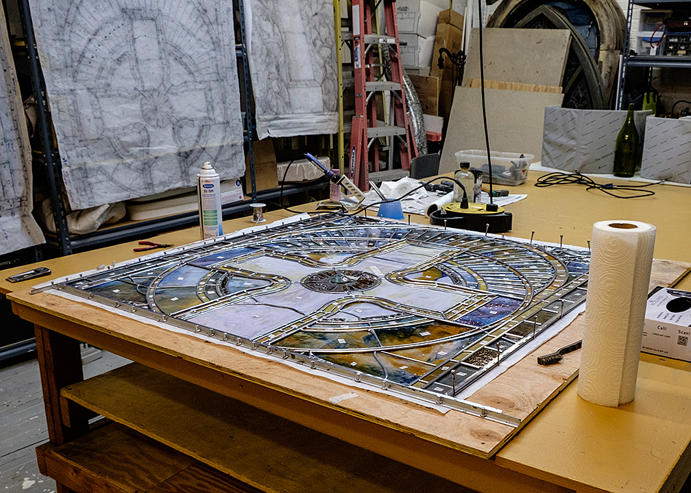 After years of inattention and at least one substandard repair over 50 years ago, work is underway to restore all the Battell Chapel windows. Much like putting together a jigsaw puzzle, Michael Skrtic and his team at the Glass Source in Shelton, Conn., have recently completed the painstaking restoration of the central panel of the Maitland altarpiece. The work included mapping and cataloging and then the disassembly, cleaning, repair and reassembly of more than 1,800 pieces. The restorers are now waiting for Mother Nature’s cooperation to reinstall the window, along with its new exterior safety glass.