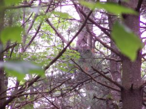 On April 23, ornithologist Bob Barbieri came and confirmed they were Cooper’s hawks. The larger female was in second year plumage, the smaller male in stunning adult plumage. The female sat on a deciduous tree’s branch calling while the male was deep in the pines calling and sometimes flying through the branches.