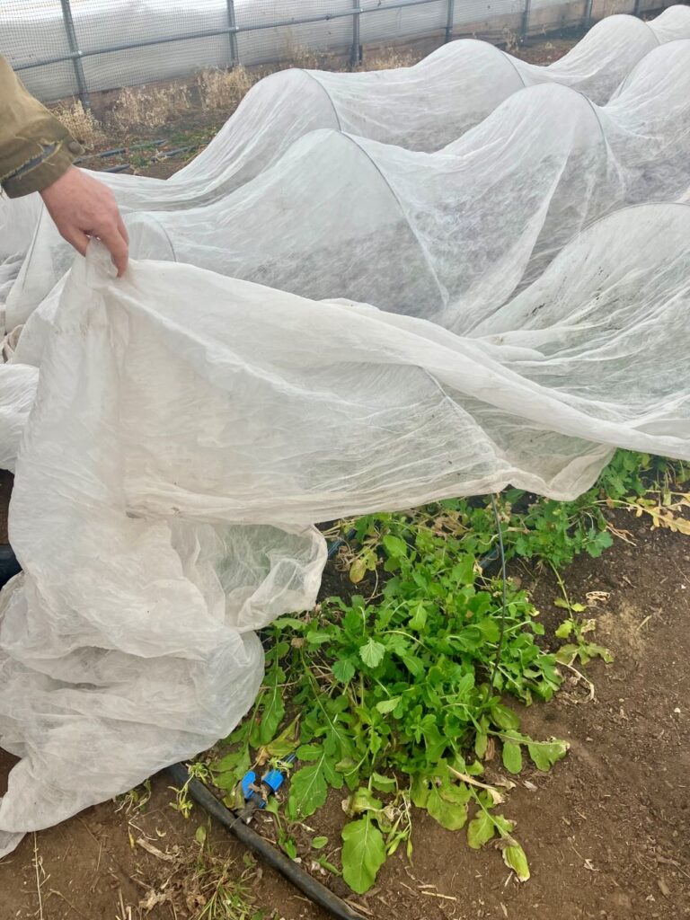 The tunnel is not heated, but it gets enough daylight starting in February to begin the growing season. During this cold time of year, nighttime row covers protect against frost damage. A small fan maintains an insulating air space between the two layers of poly. Temperature sensors will automatically open the sides of the tunnel when it gets too hot in the summer.