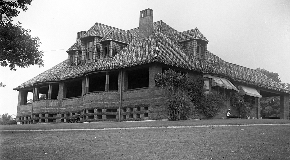 The Eldridge Gymnasium, now Town Hall, was built in 1892. This view of the rear of the building, then with an open veranda, features the vibrant multi-colored buff and beige Mission tiles of the roof, sadly removed. The Gymnasium quickly became a hub of activity. In addition to grass tennis courts in front, there were rowing machines, exercise equipment and bowling alleys in the basement. Morning and evening concerts took place in the spacious interior, as well as lectures and dances. In 1906, Mark Twain’s daughter, Clara Clemens, made her singing debut at the Gymnasium. Her famous father was in the audience that night and, in an effort not to upstage Clara, he waited until after her performance to tell the audience about his own debut as lecturer in his famous speech on stage fright: “My heart goes out in sympathy to anyone who is making his first appearance before an audience of human beings… I shall never forget my feelings before the agony left me, and I got up here to thank you for helping my daughter, by your kindness, to live through her first appearance. And I want to thank you for your appreciation of her singing, which is, by the way, hereditary.”