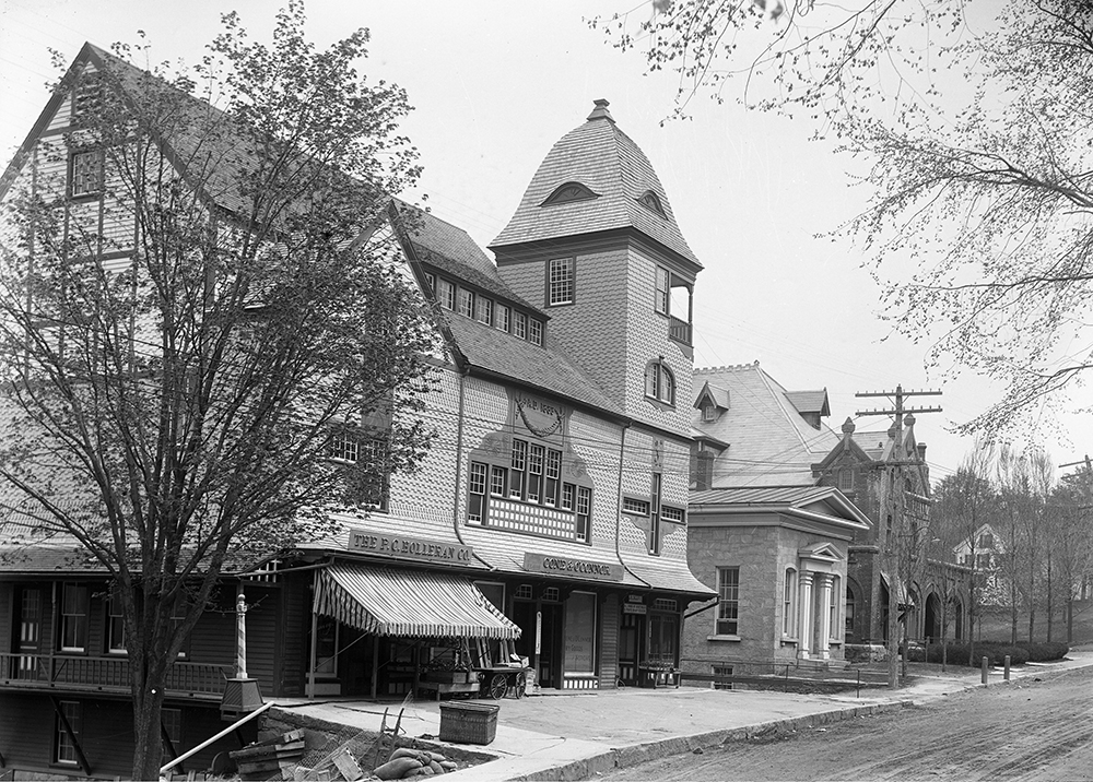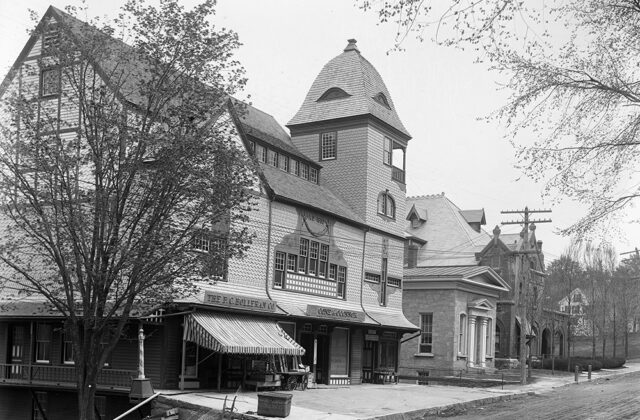 During the first half of the 20th century, multiple businesses occupied the first floor of Village Hall, now known as Infinity Hall. Built in 1883 as a multi-purpose building, Village Hall provided the town with a commercial complex as well as a much-needed cultural center upstairs, where townsfolk could gather for lectures, concerts, dances and other entertainment. The hall opened on July 30, 1884, with a performance of Gilbert & Sullivan’s “Pinafore.” The following year, members of the Norfolk Roller Skating Association used the second-floor space as a roller-skating rink on Tuesday and Friday evenings, with spectators admitted to the balcony. Later, variety and minstrel shows, silent movies and school graduations took place there. The shops on the ground floor were anchored by Cone & O’Conner in the central section. Next door was P.C. Holleran’s meat market and, at the far end, James Scott’s fruit and vegetable store. The striped barber pole at the corner of the building was the sign for Louis Waldecker’s barber shop, located in the rear. The entire complex offered residents a one-stop shopping and cultural experience.