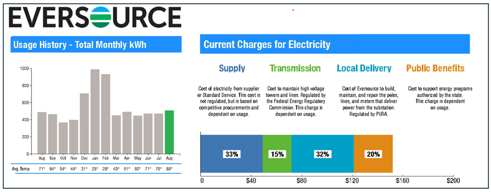 First, Eversource customer bills were redesigned. A review of a current Eversource bill shows all four areas of costs—supply, transmission, local delivery, public benefits—presented clearly.