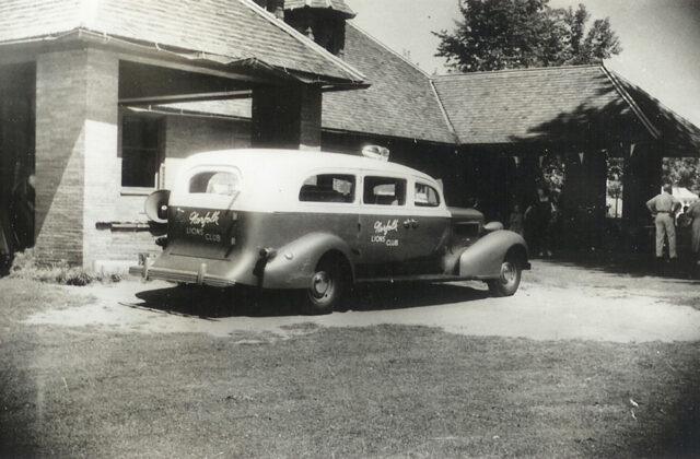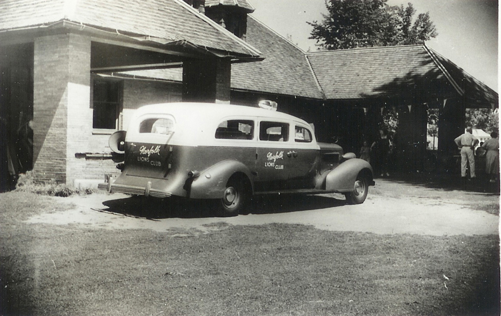 Emergency medical transport has changed dramatically over the past century, evolving from simple horse-drawn carriages to life-saving ambulances with advanced medical equipment. The original Norfolk Lions Club ambulance, a Henney Packard, is parked in front of Town Hall in this photograph, probably taken soon after the Lions Club was organized in January of 1951. Unlike the modern ambulance, ambulances at this time were not mobile health units and provided only transportation to local hospitals. In the 1960s the focus shifted from transportation to emergency medical service. Ambulance attendants were trained in CPR and other life-saving procedures, allowing them to deliver better care en route to hospitals. The Norfolk Lions Club Ambulance has provided free volunteer ambulance service 24 hours a day for almost 75 years.