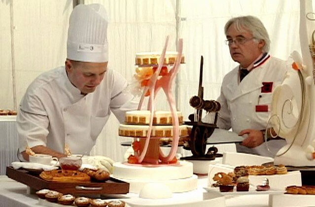 Chef Jacquy Pfeiffer (L) sets up his buffet for the final MOF judging in Lyons, France, back in 2007