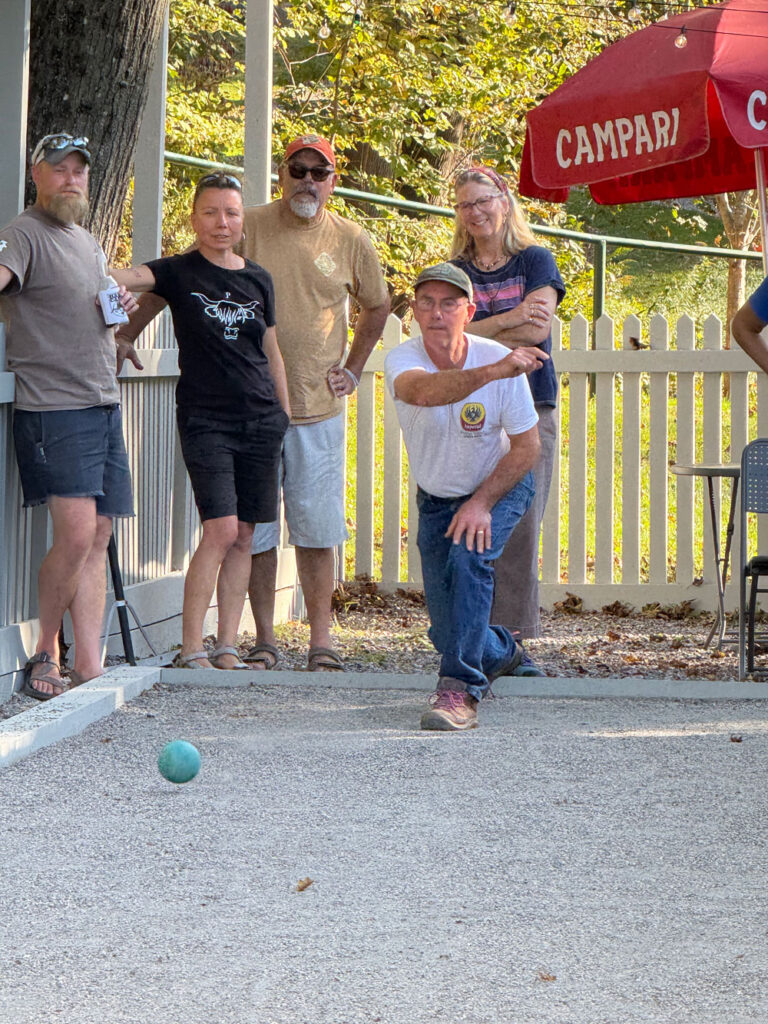 Bowling with Acorns: Eight teams competed in a good-natured bocce tournament—once the acorns were swept away, that is—on the bocce court behind 10 Station Place on Sunday, Oct. 5. Antonio Guindon, whose team failed to advance past the first round, bowls his best under the watchful gaze (from left) of Roger Johnson, Katka Jonsdottir Hannelova, Sean Sweeney and Lynn Sweeney