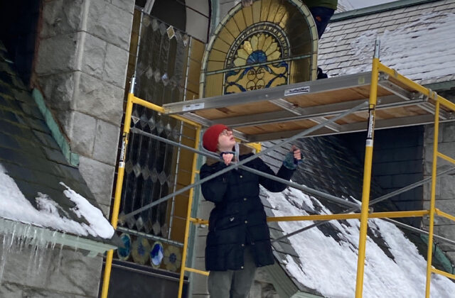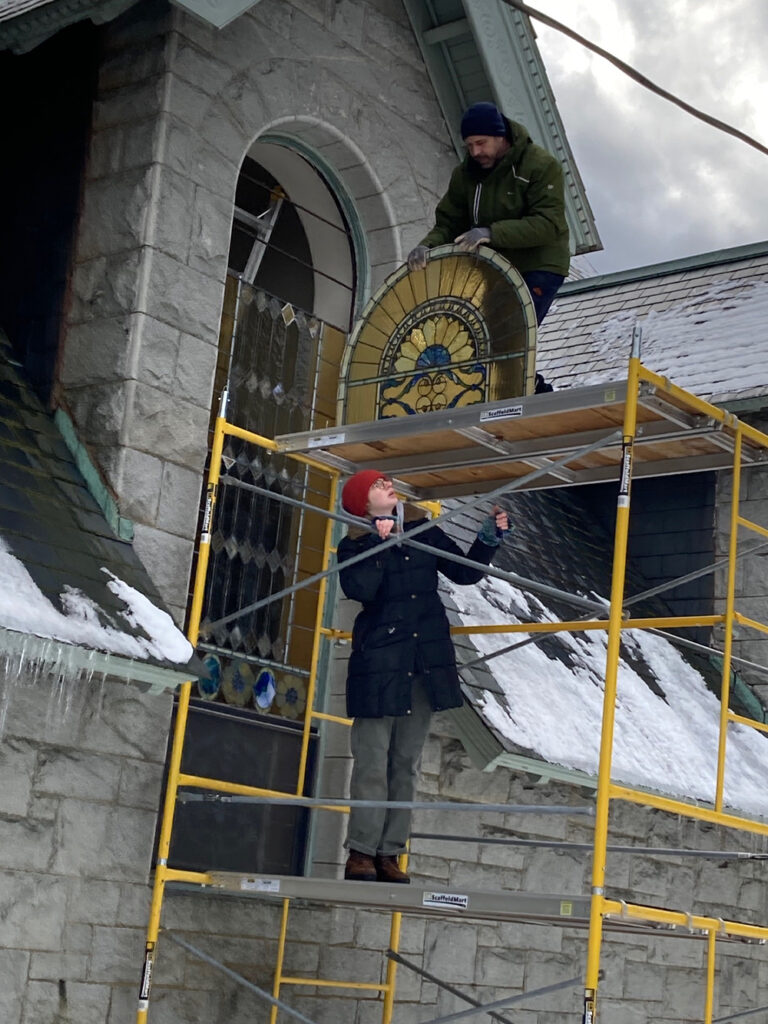 An expert team from the Glass Source Stained Glass Studio spent nearly six hours in cold mid-January weather care-fully removing a cathedral stained glass window from Battell Chapel at the United Church of Christ before transporting it to their studio in Seymour for restoration. In this photo, Michael Skrtic balances one section of the window as colleague Jennifer Palermo stands ready to receive it. Marie Civco, who leads the effort to raise funds for the restoration, said the window had been sealed with a cement-like substance, making it “extremely difficult” to remove. Repairs and res-toration have moved forward thanks to gifts totaling more than $50,000. Civco said she hopes the window will be back by spring. Fundraising will continue to support restoration of a remaining win-dow in the chapel and the major stained glass windows in the Meeting House.